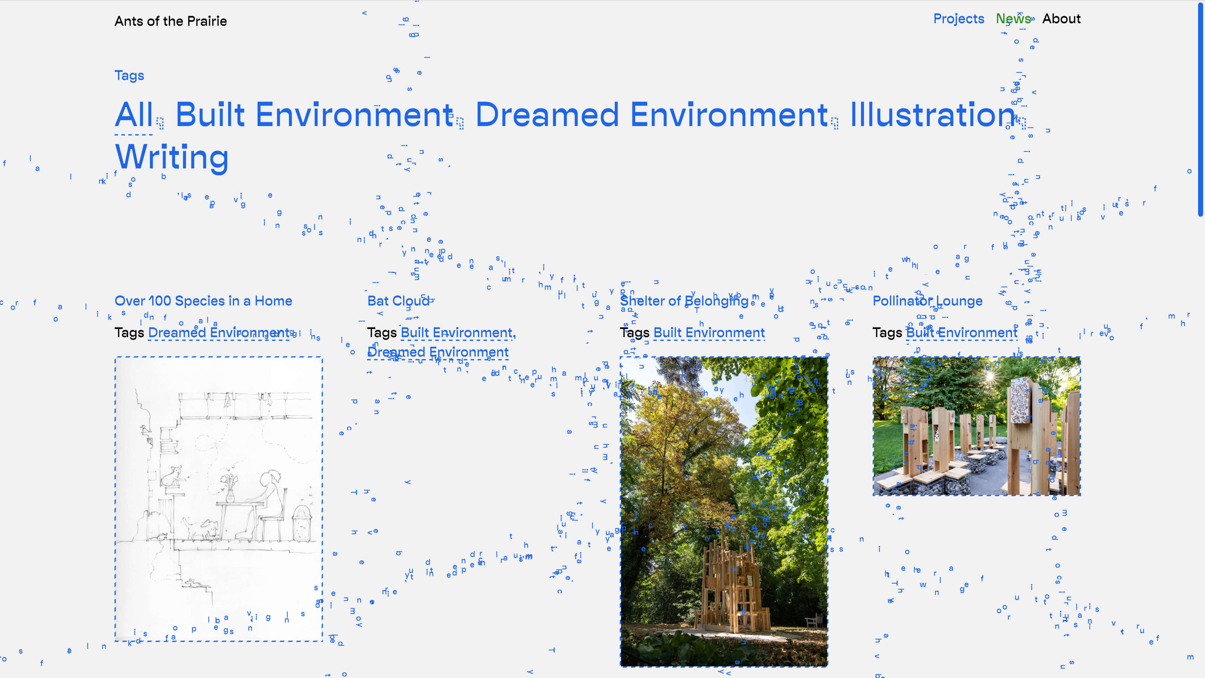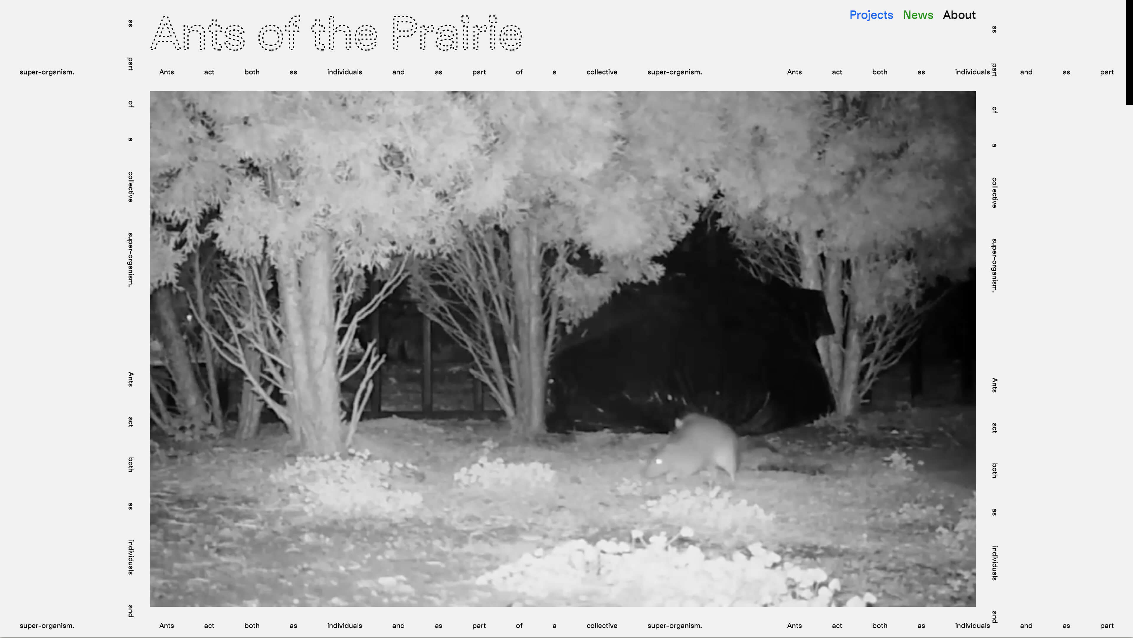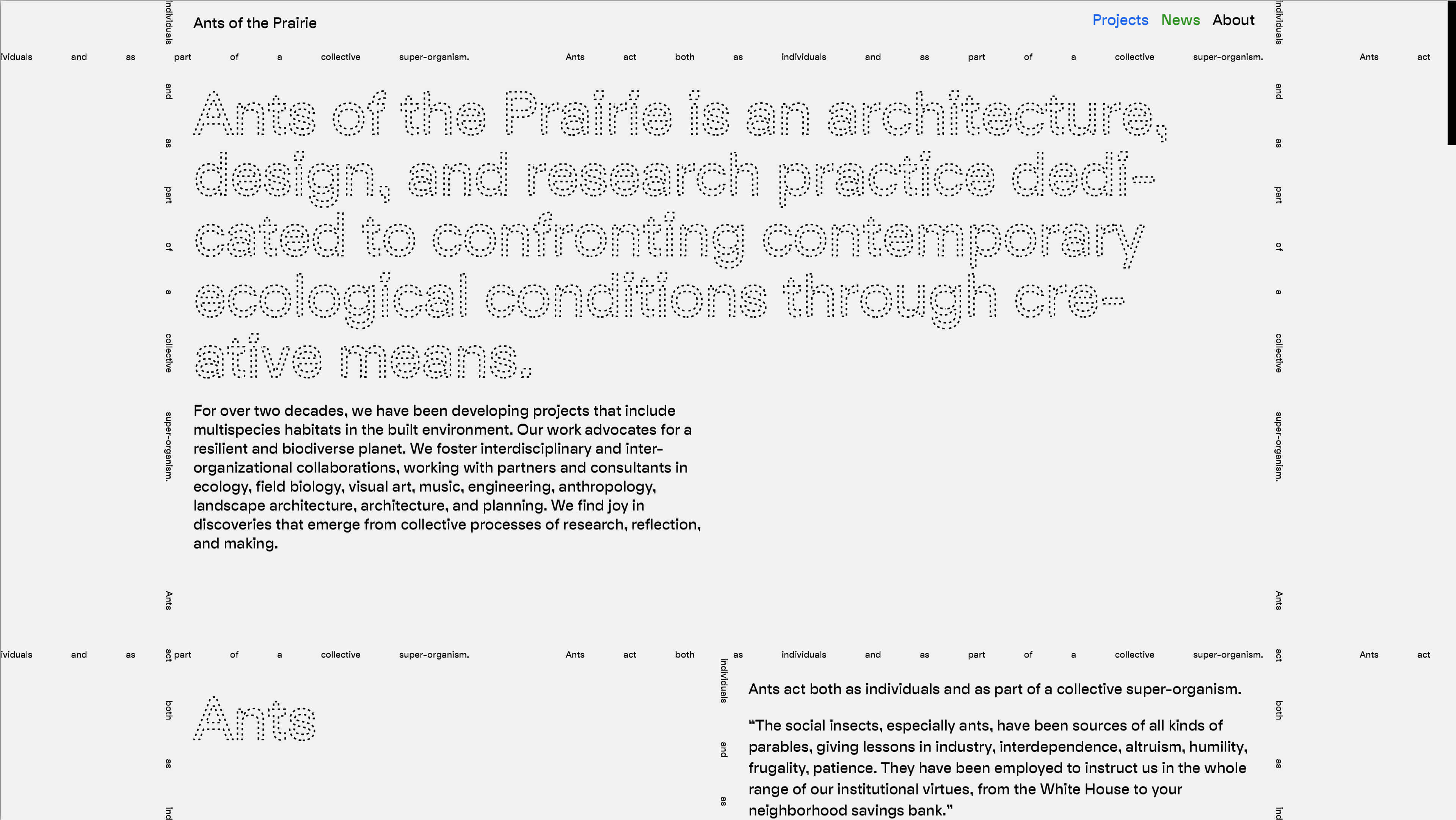 I designed and developed the website for Ants of the Prairie, an NY-based architecture and research practice that is dedicated to developing ecologically-minded habitats for nonhuman species. In tribute to the pavement ants of New York, we proposed structuring the website with “pavement” grids populated by relevant quotes marching in ant formation.