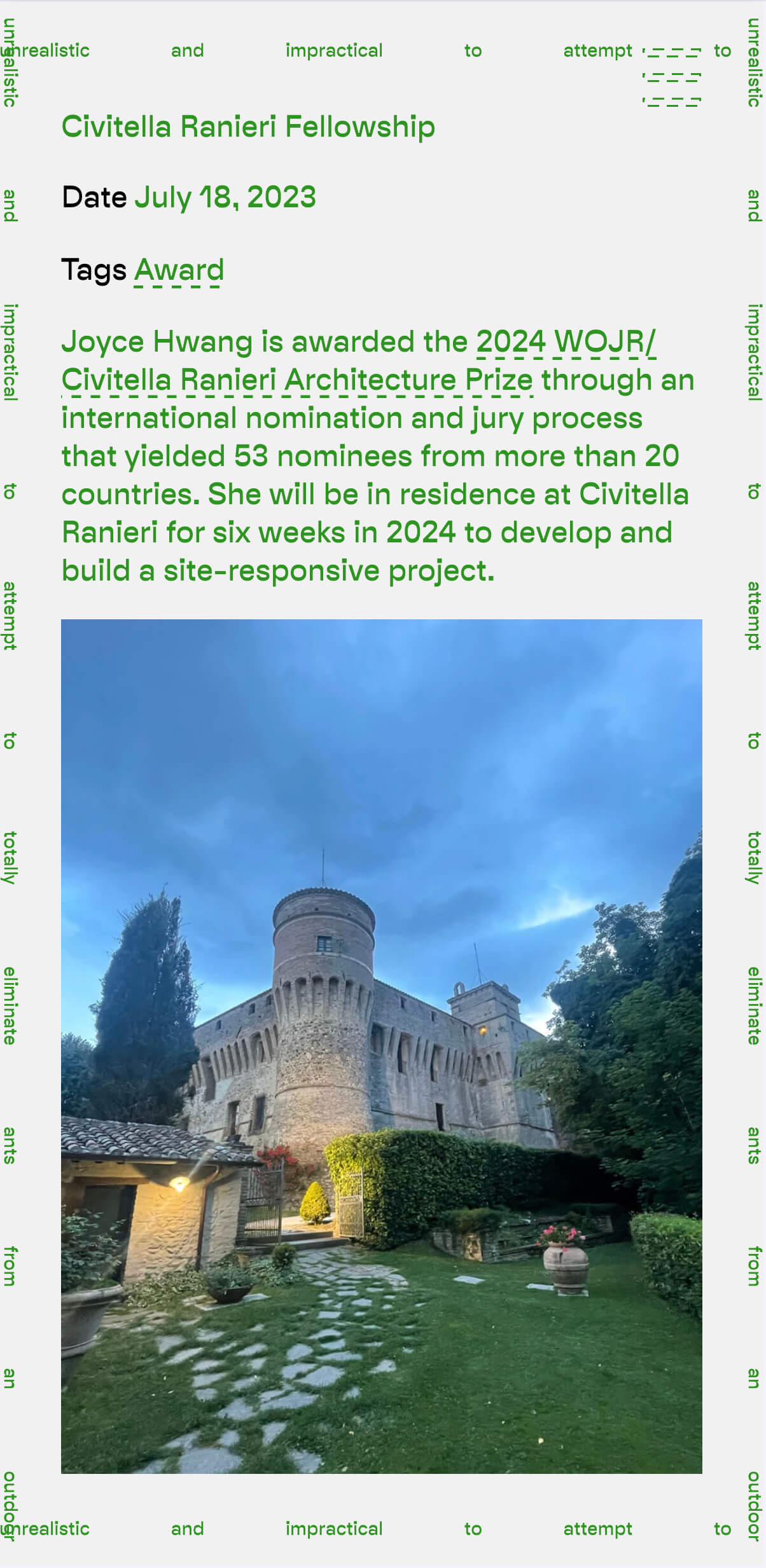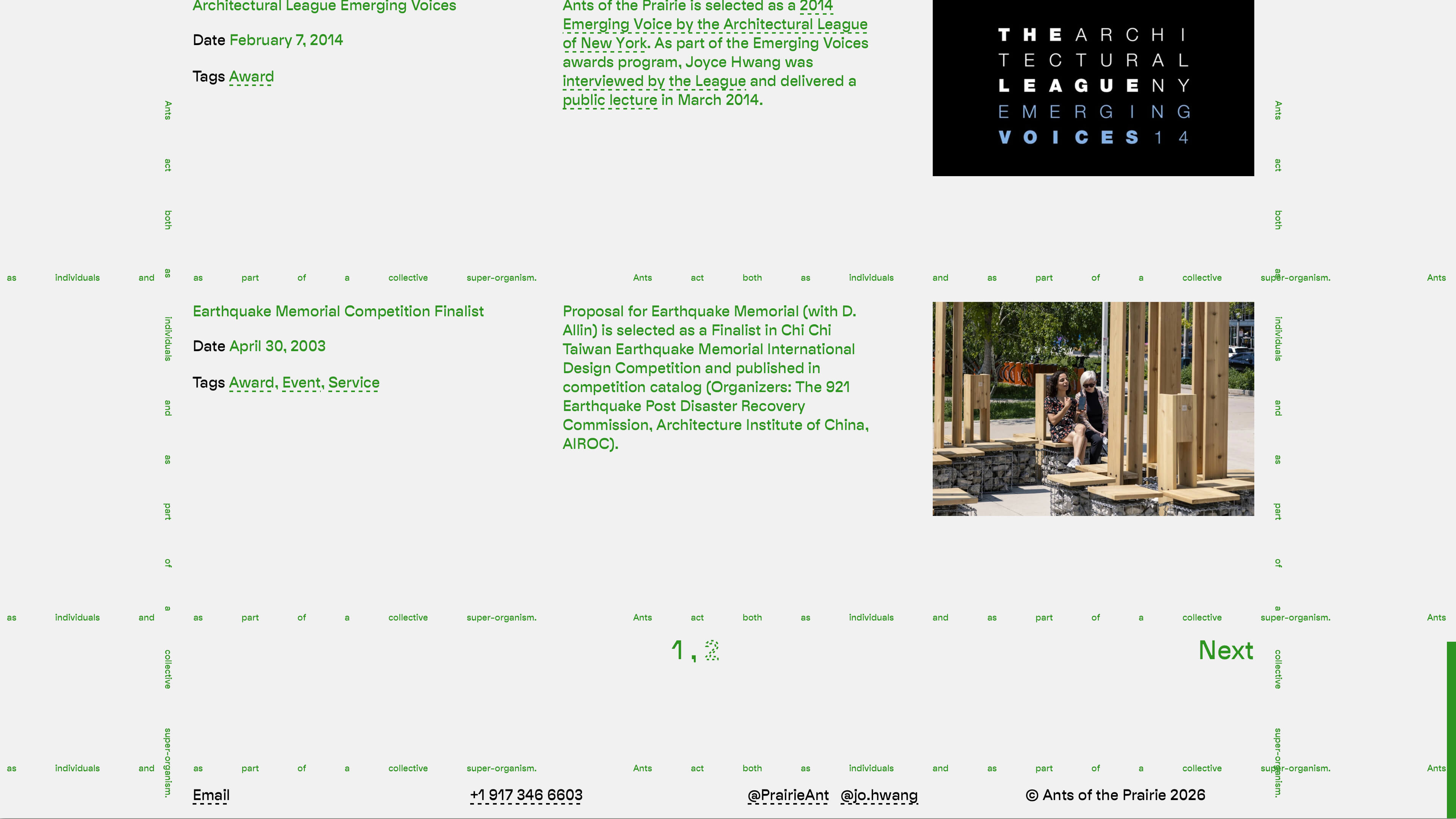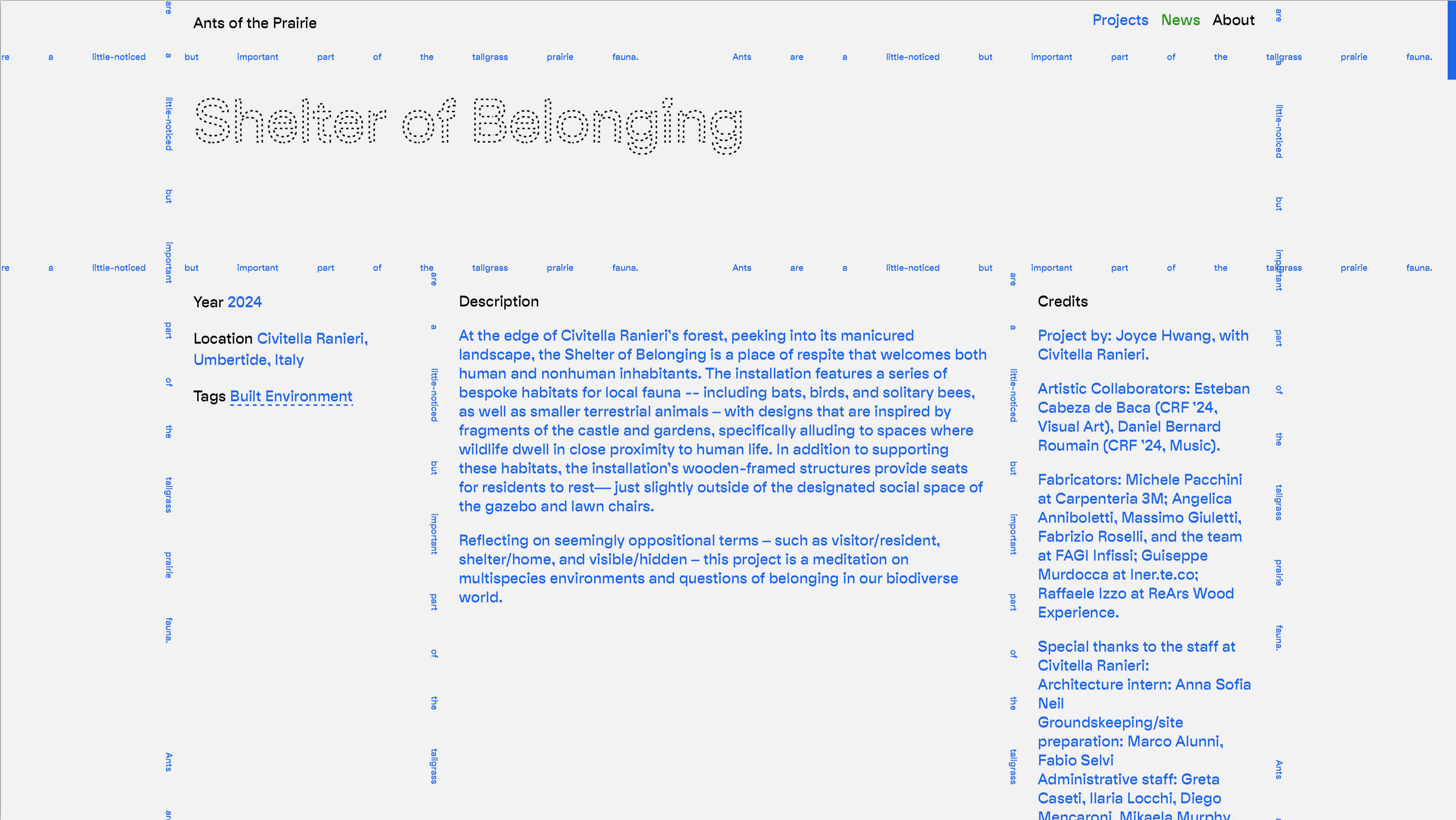 I designed and developed the website for Ants of the Prairie, an NY-based architecture and research practice that is dedicated to developing ecologically-minded habitats for nonhuman species. In tribute to the pavement ants of New York, we proposed structuring the website with “pavement” grids populated by relevant quotes marching in ant formation.