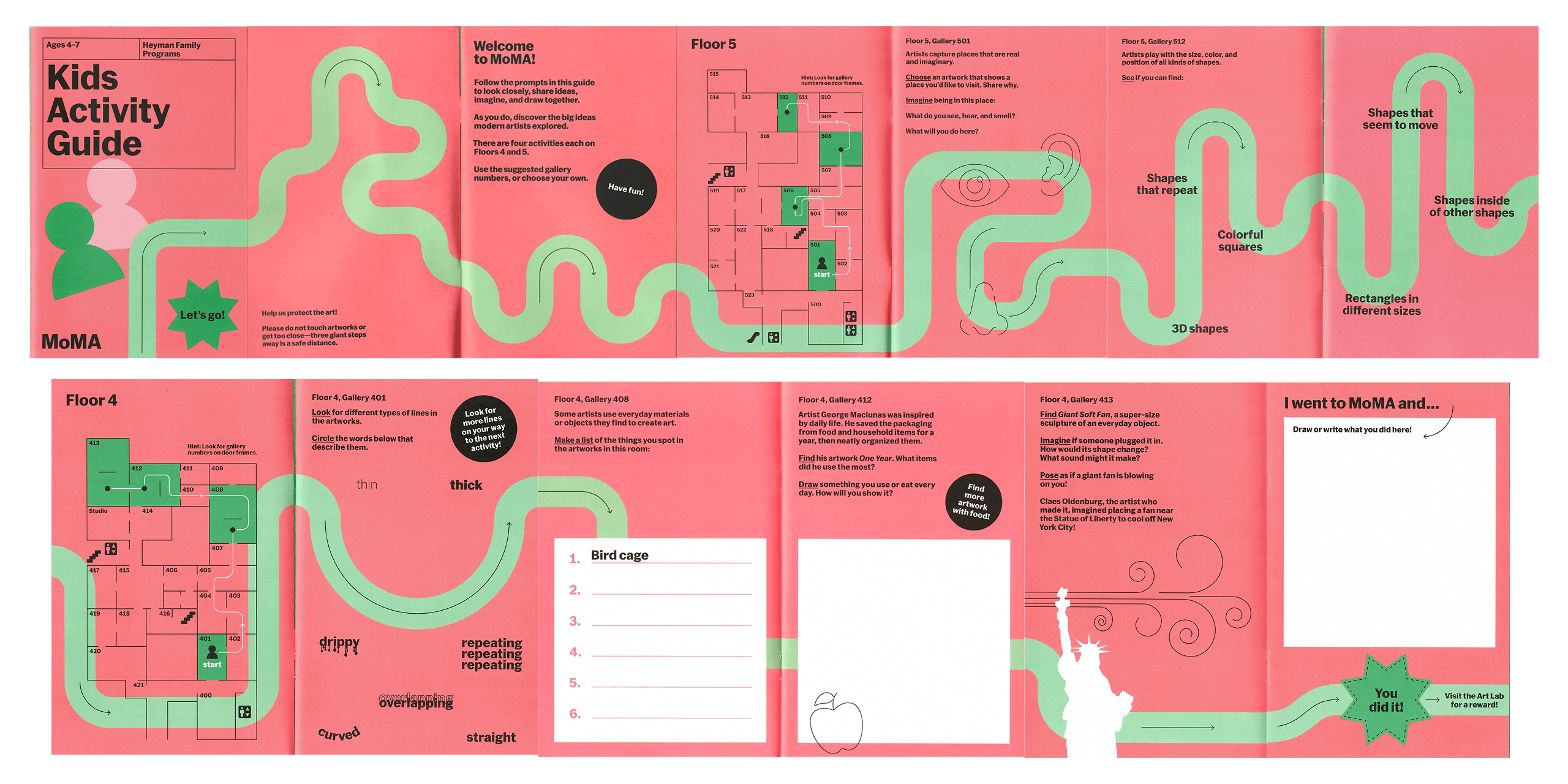 I designed the annual Young Kids’ guide for Learning & Engagement at MoMA, which features activities families can undertake throughout the museum galleries. This year’s bilingual guide invites kids to use it as an interactive gameboard, and is split between English and Spanish sections flipped upside down from each other to signal the language switch. In collaboration with Associate Design Director Eline Mul.