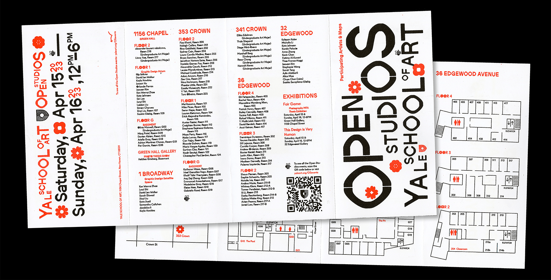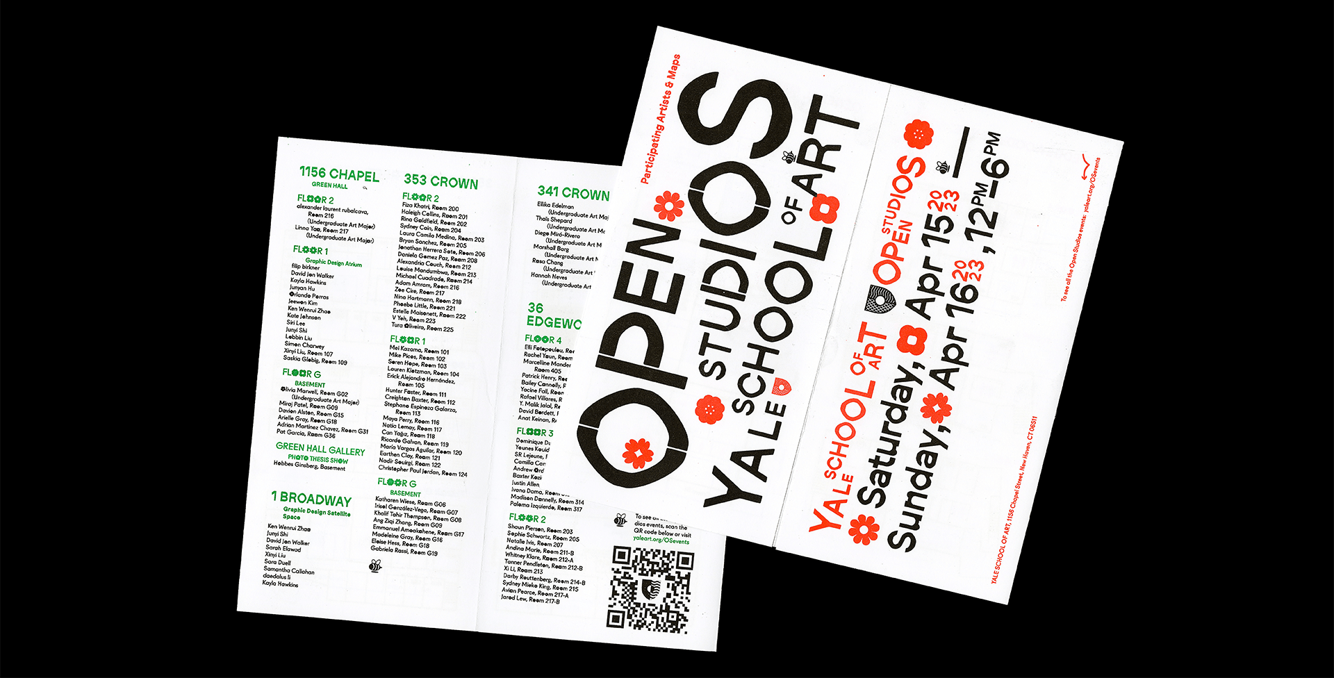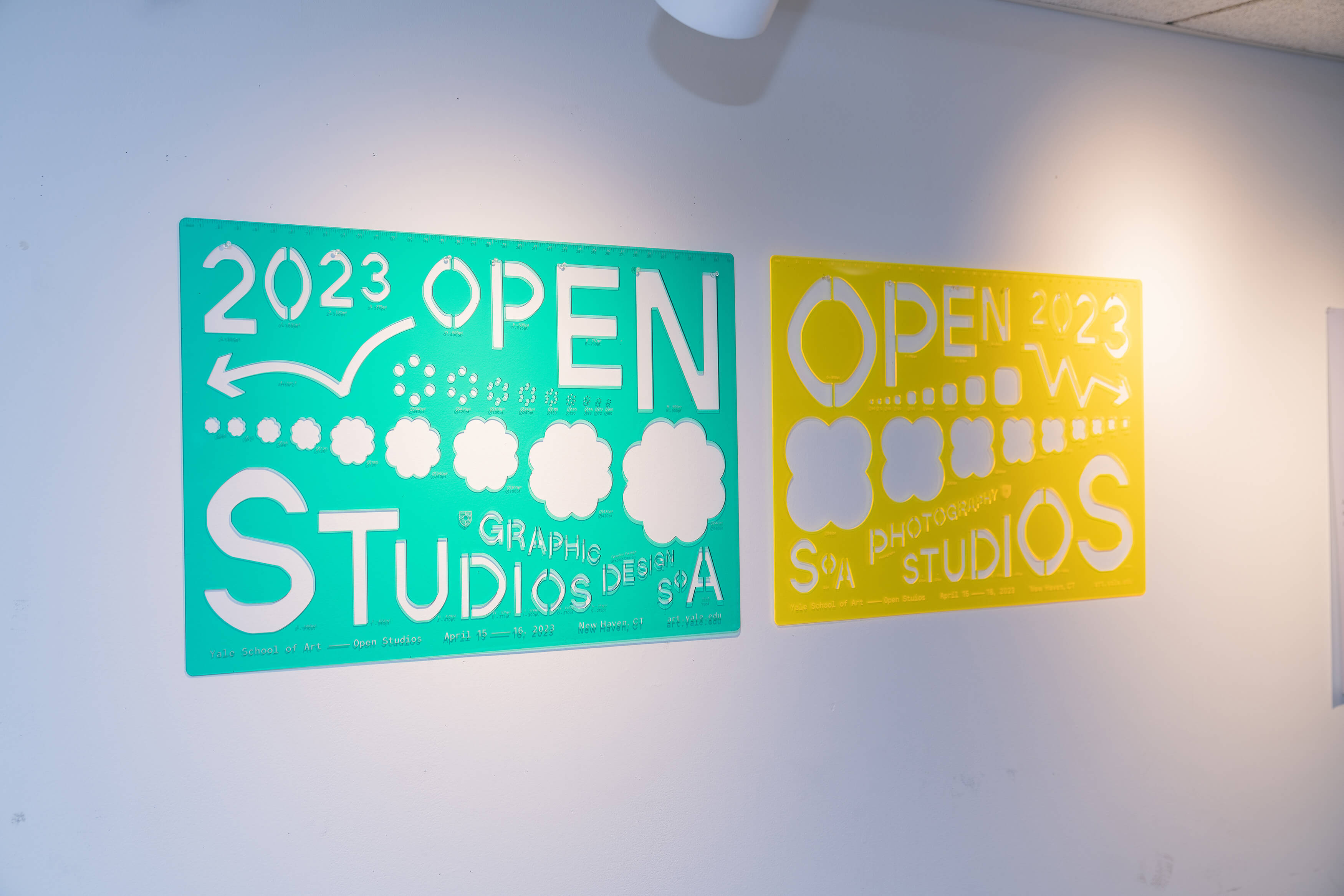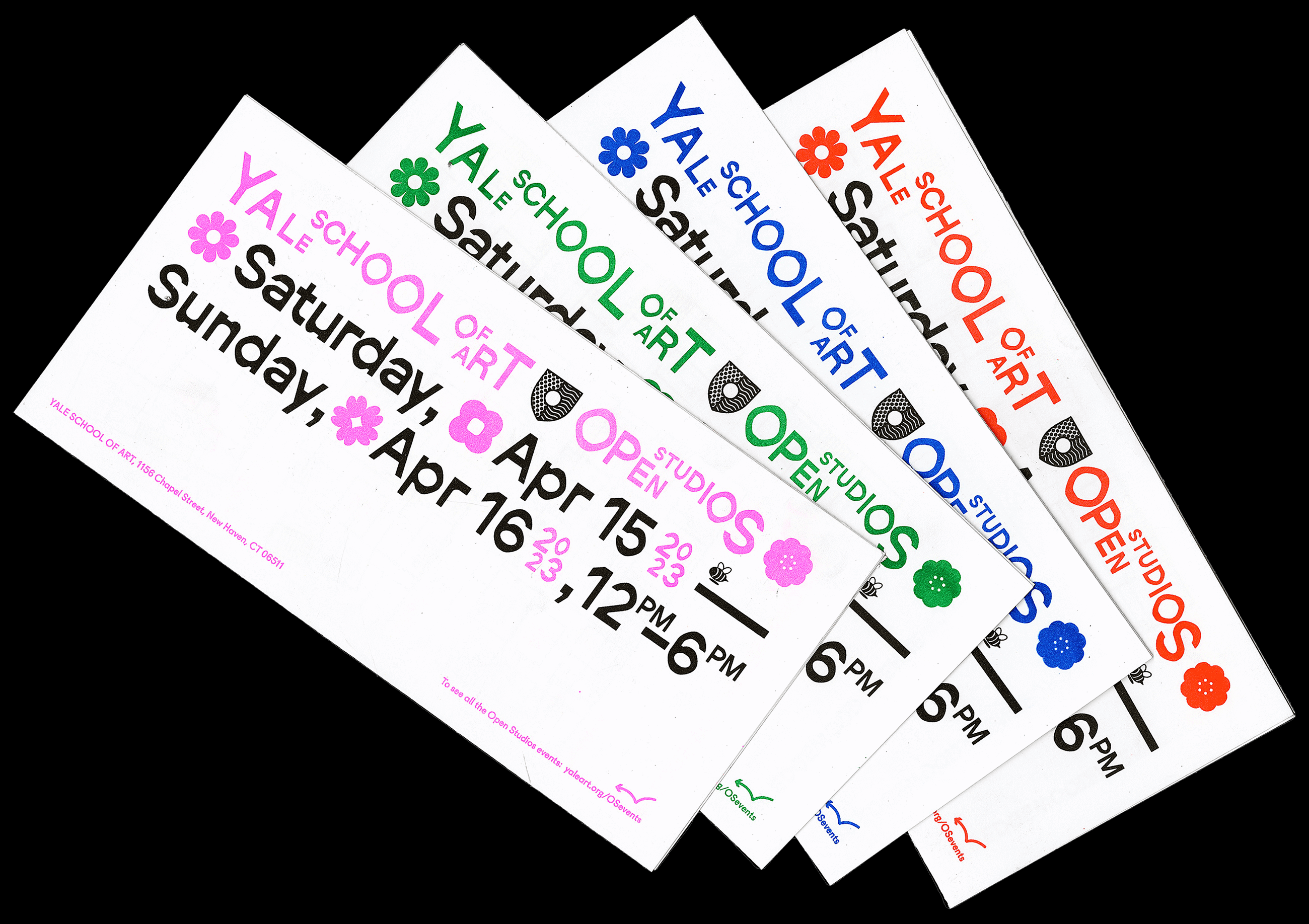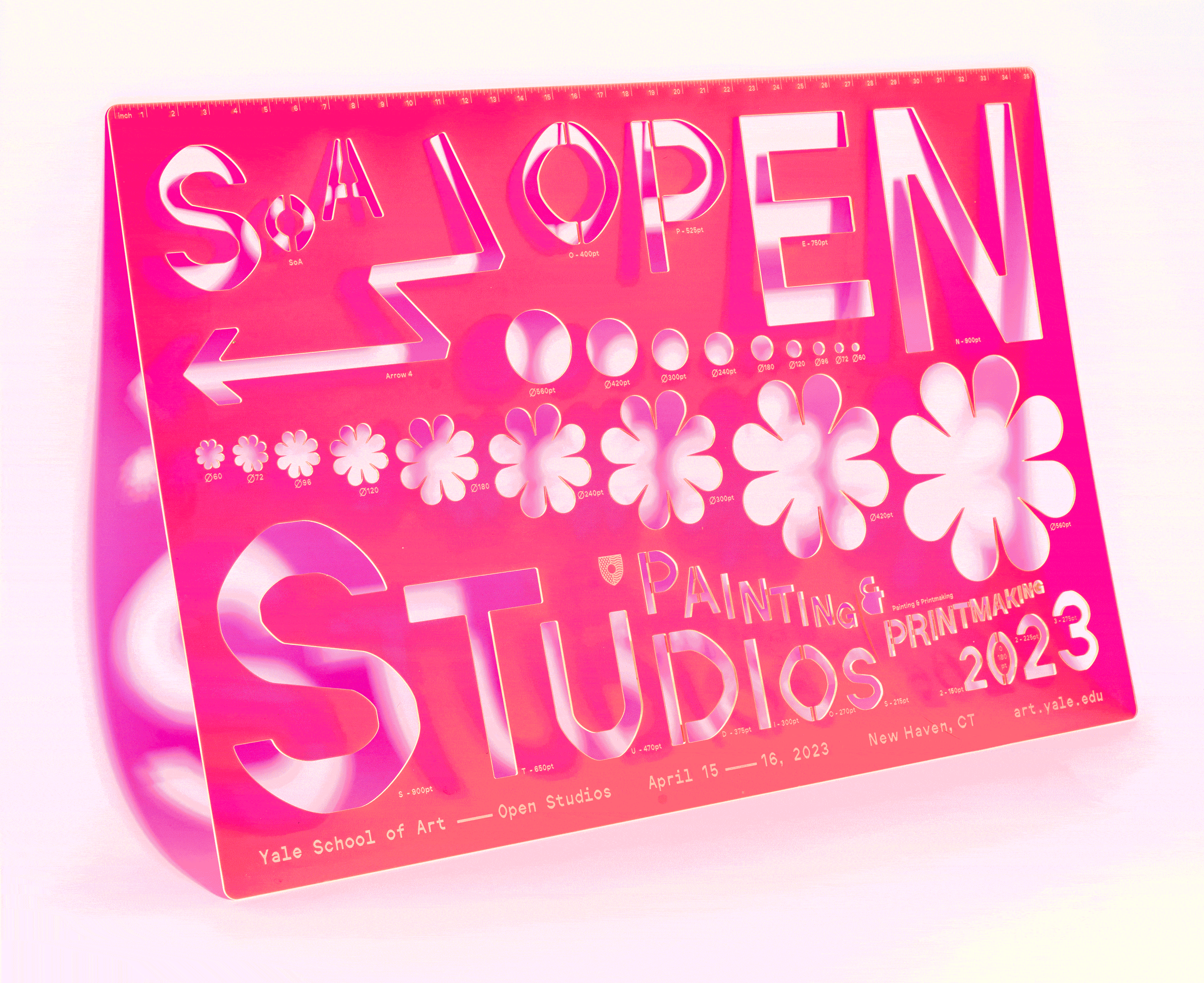 In the spring of 2023, the Yale School of Art hosted its annual Open Studios, drawing a record-setting 1100 attendees. Jisung Park (Yale ’23) and I designed the identity and fabricated cutout acrylic wayfinding signs for all 4 graduate departments, the undergraduate studios, and 2 new satellite galleries. We were inspired by shape rulers, springtime florals, and the idea of creating signage from both the positive and negative space of our materials.