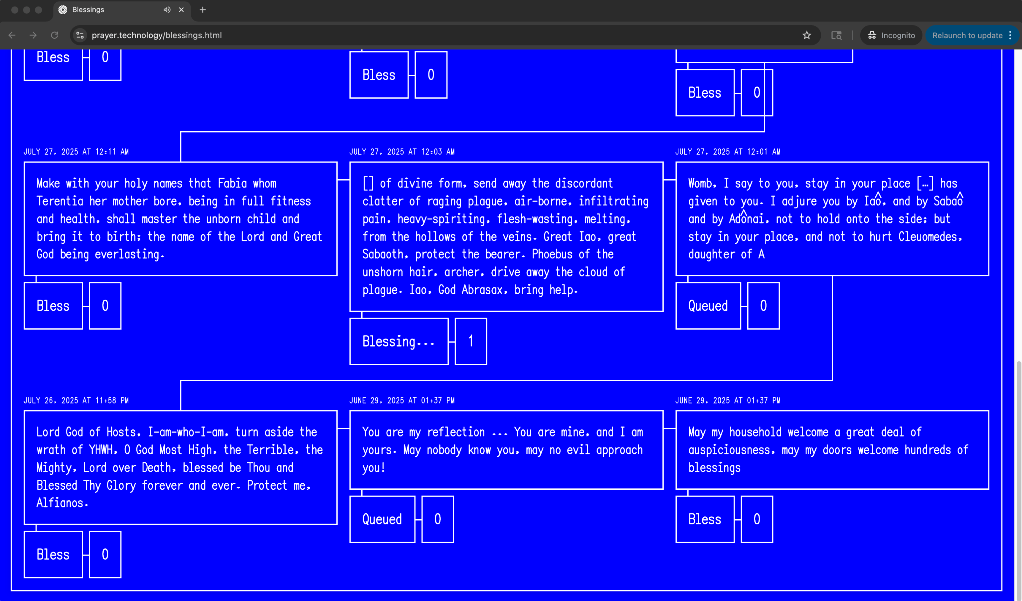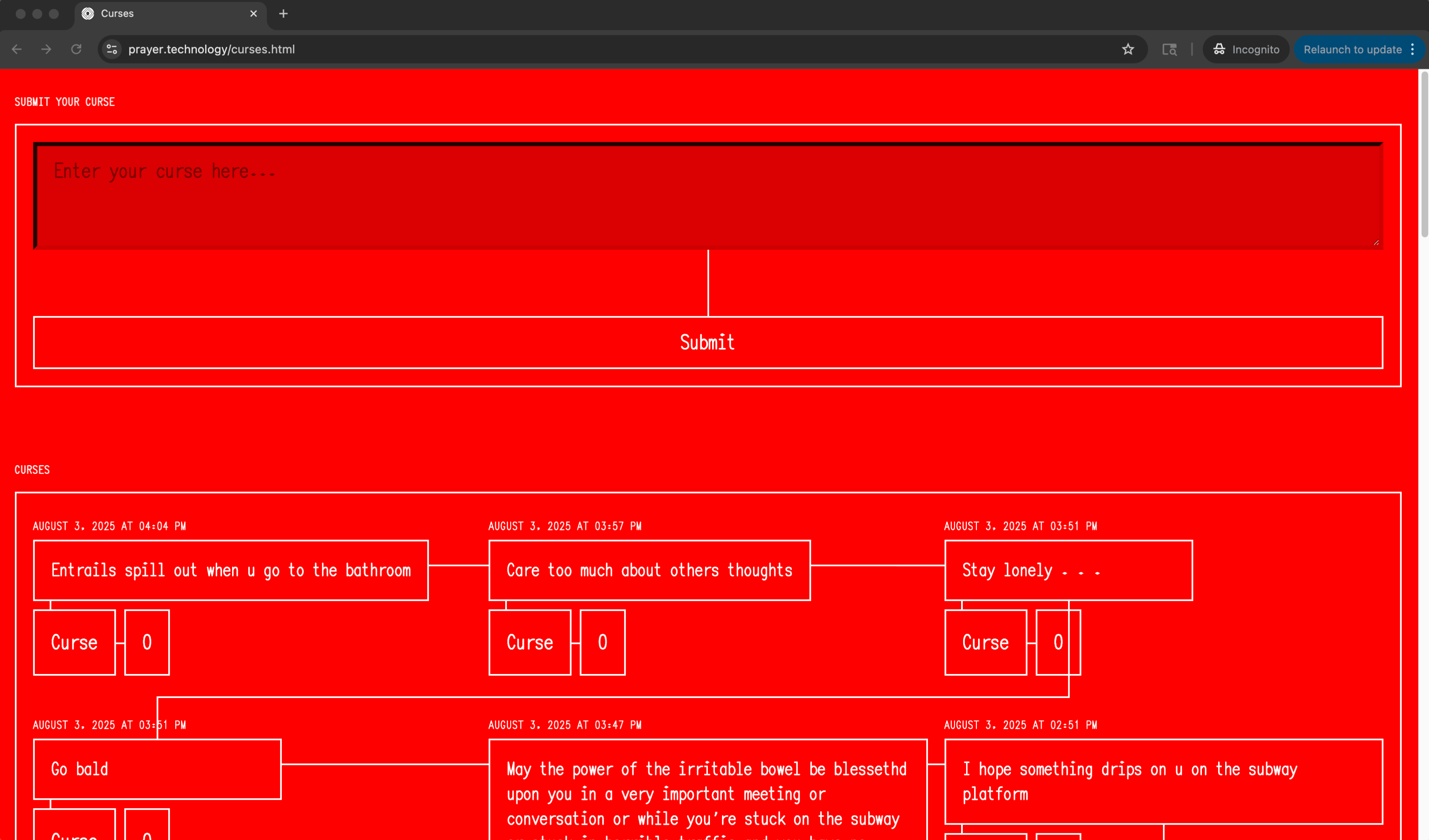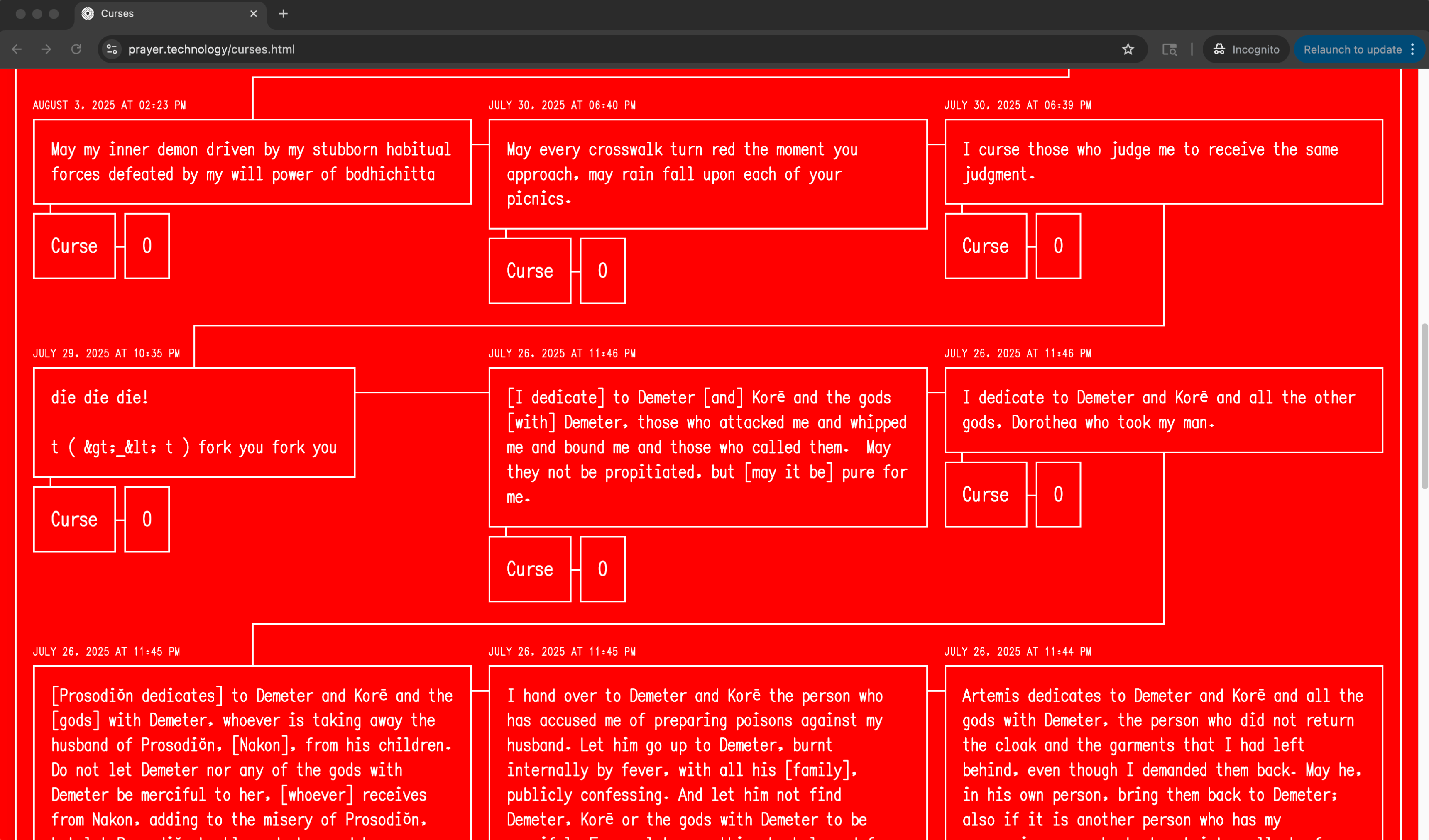 When all the methods promised to us by our systems and protocols have failed, how else can we make our desires reality? prayer.technology seeks to realize unfulfilled desires through other means—magic. This website is a crowdsourced and crowdfunding platform for blessings and curses. It collects a wide range of spells, from the premodern era to present day. Sources include Greco-Roman curse tablets, Chinese spirit tablets, the Akkadian Maqlû incantation text, and present-day visitors—among them, potentially, you.