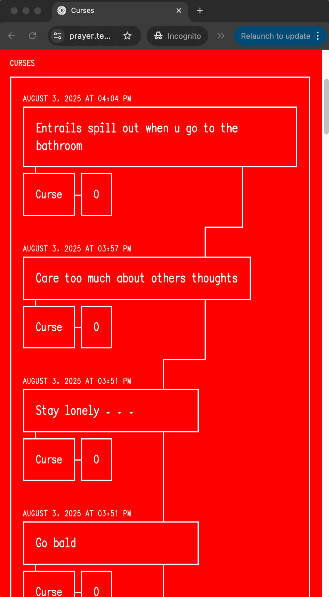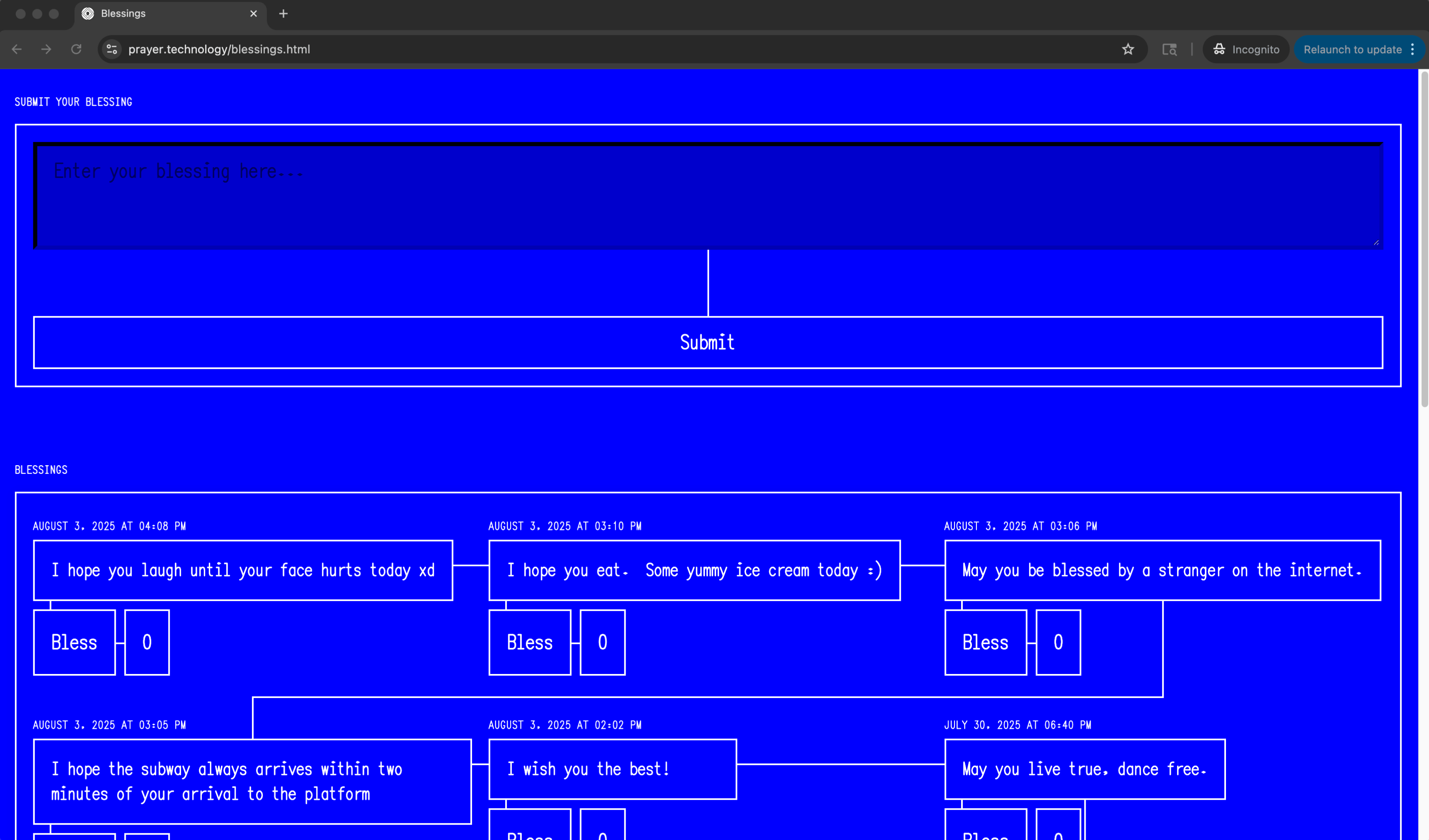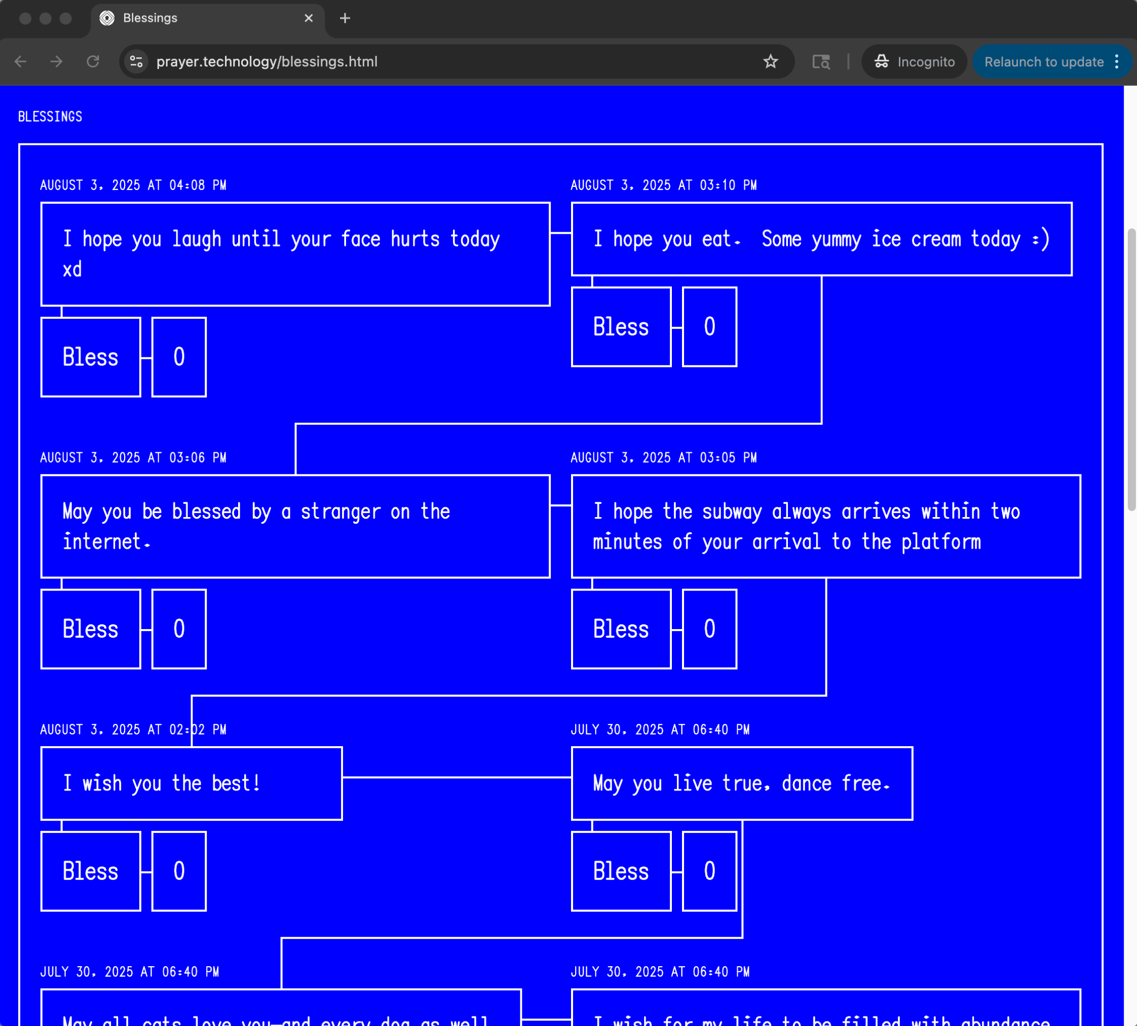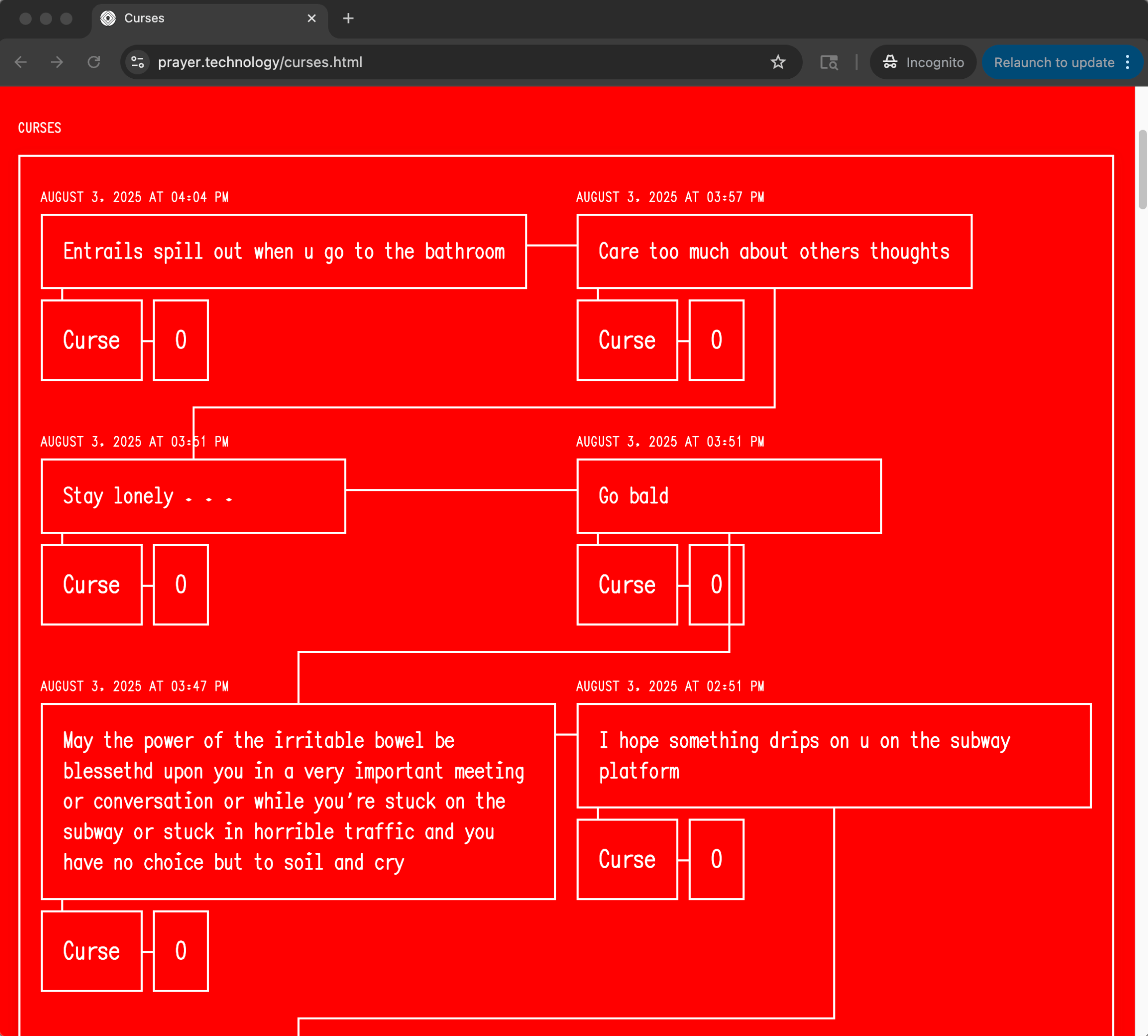 When all the methods promised to us by our systems and protocols have failed, how else can we make our desires reality? prayer.technology seeks to realize unfulfilled desires through other means—magic. This website is a crowdsourced and crowdfunding platform for blessings and curses. It collects a wide range of spells, from the premodern era to present day. Sources include Greco-Roman curse tablets, Chinese spirit tablets, the Akkadian Maqlû incantation text, and present-day visitors—among them, potentially, you.