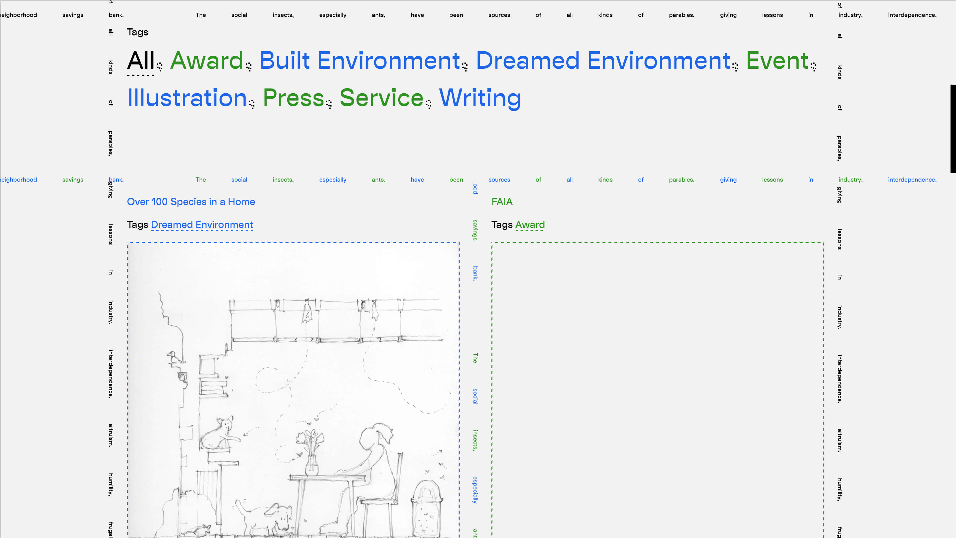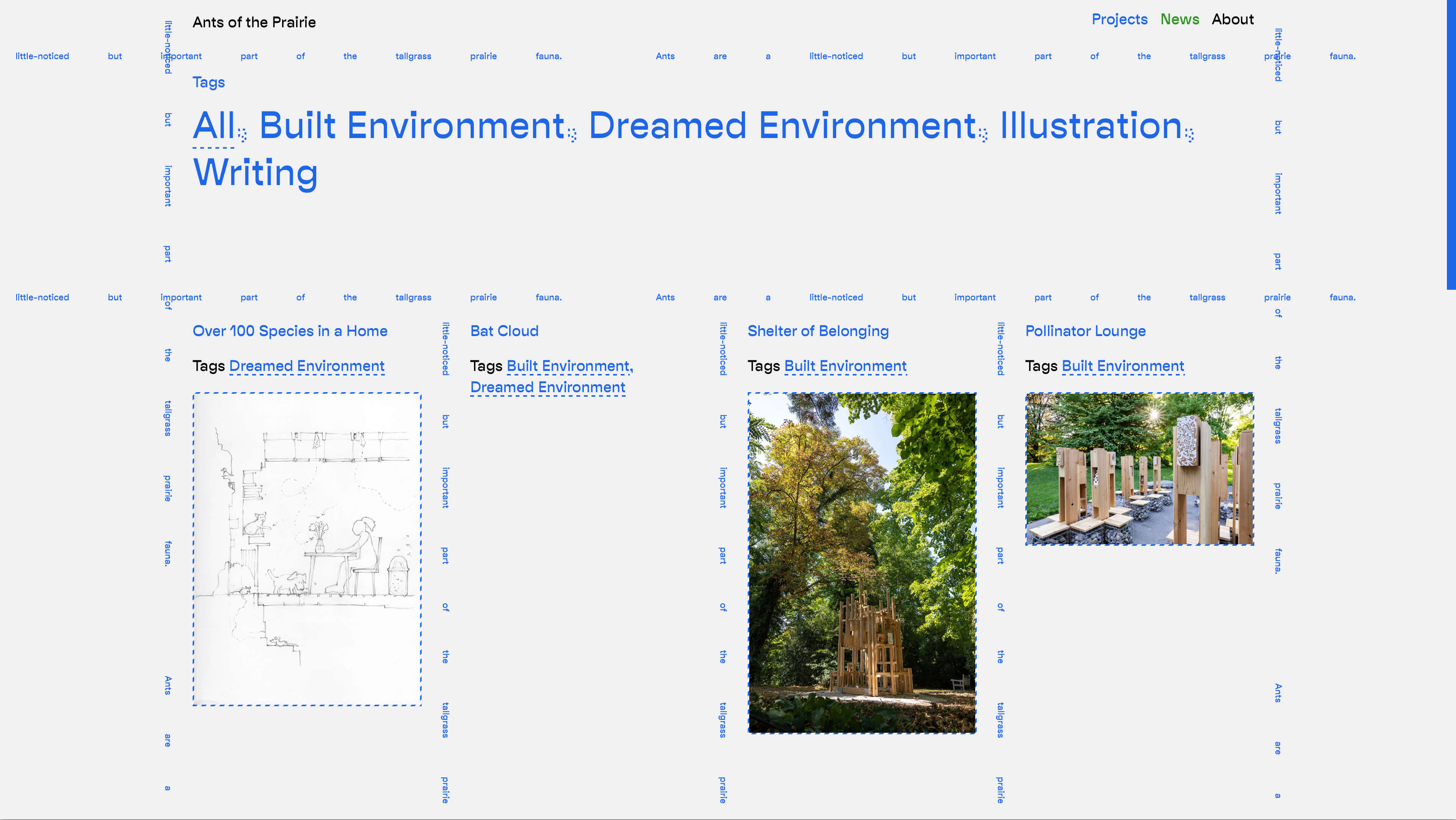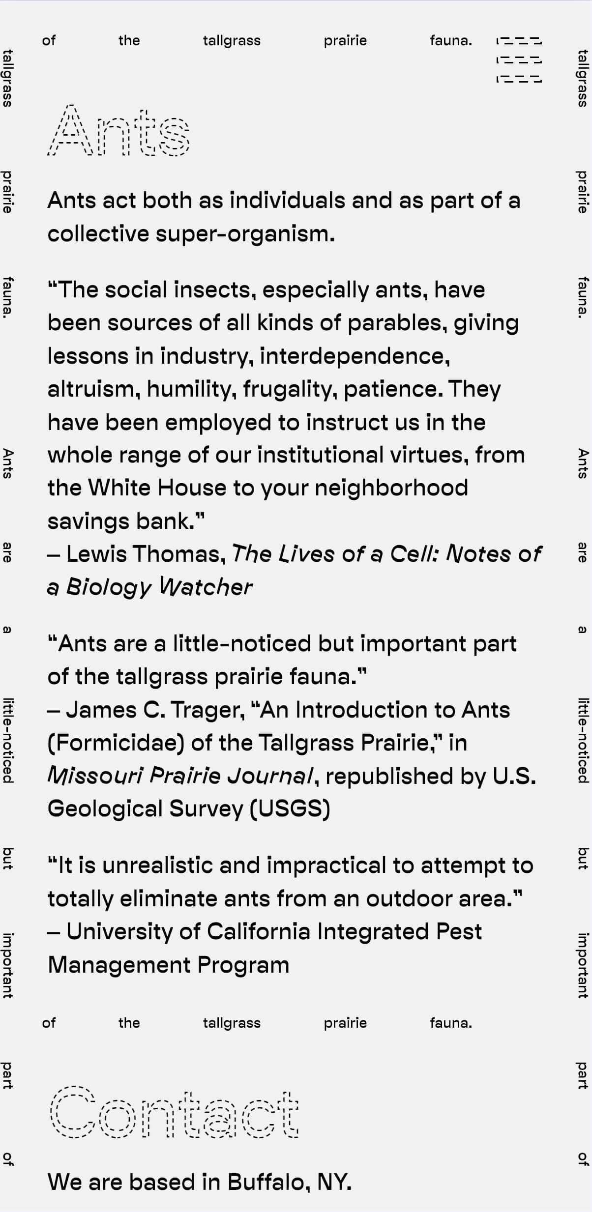 I designed and developed the website for Ants of the Prairie, an NY-based architecture and research practice that is dedicated to developing ecologically-minded habitats for nonhuman species. In tribute to the pavement ants of New York, we proposed structuring the website with “pavement” grids populated by relevant quotes marching in ant formation.